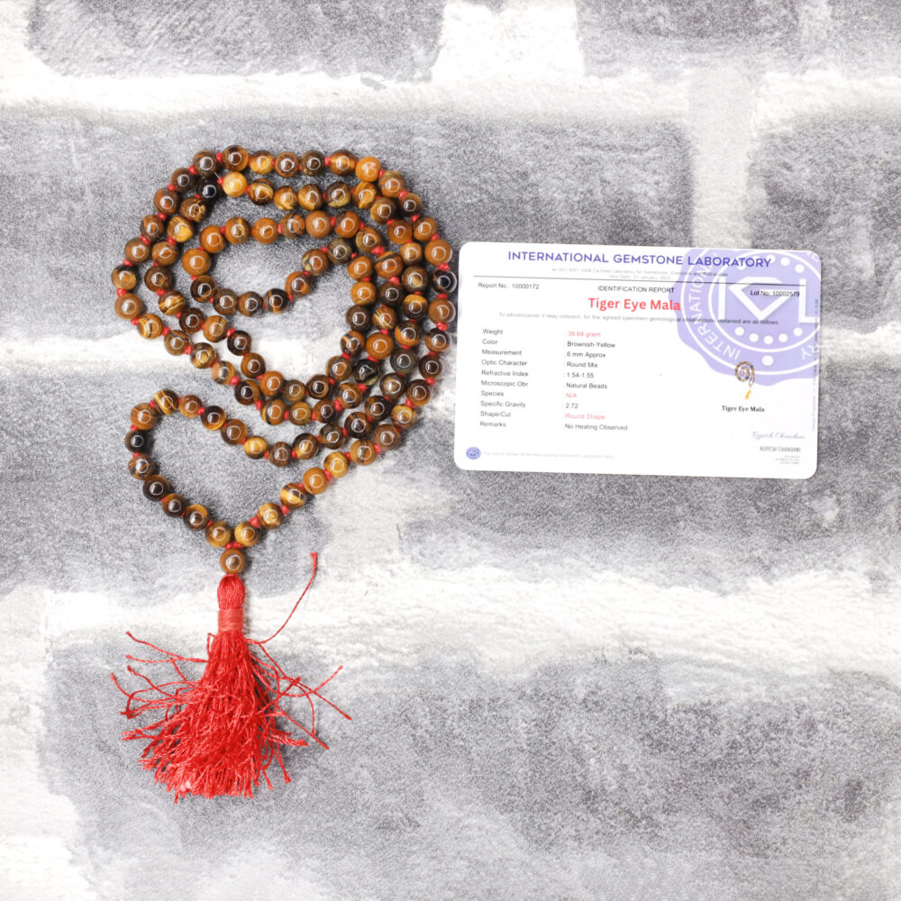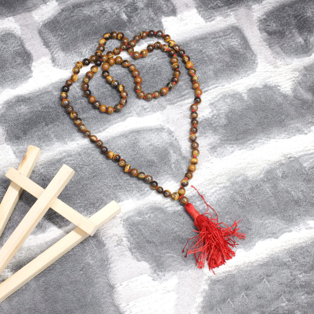 The Tiger Eye Mala is a carefully handcrafted rosary made with genuine Tiger Eye beads, traditionally valued for protection, courage, and clarity of thought. This mala is believed to help remove obstacles, enhance focus, and attract positive opportunities, especially related to career growth, international ventures, and new beginnings. Each bead is hand-selected and strung to ensure authenticity, durability, and natural beauty.